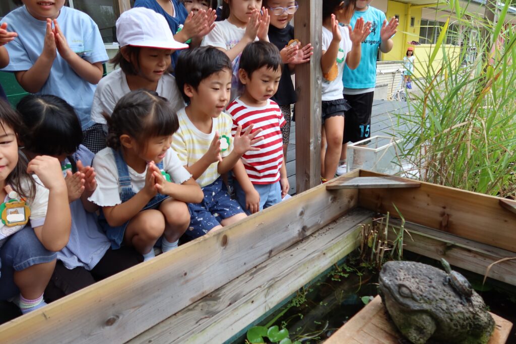 亀・・・名前は「カメルン」🐢 今まで、クラスのお部屋で飼育していましたが、人が大好き、活発に動き回り、そろそろ大きな池に放そう~と、年長児がお池に放してあげました。「バイバイ~」「広い池で楽しんでね」はじめは、どんな動きをするのか、静かに見守っていました。いつでも会えるからね・・・またね。