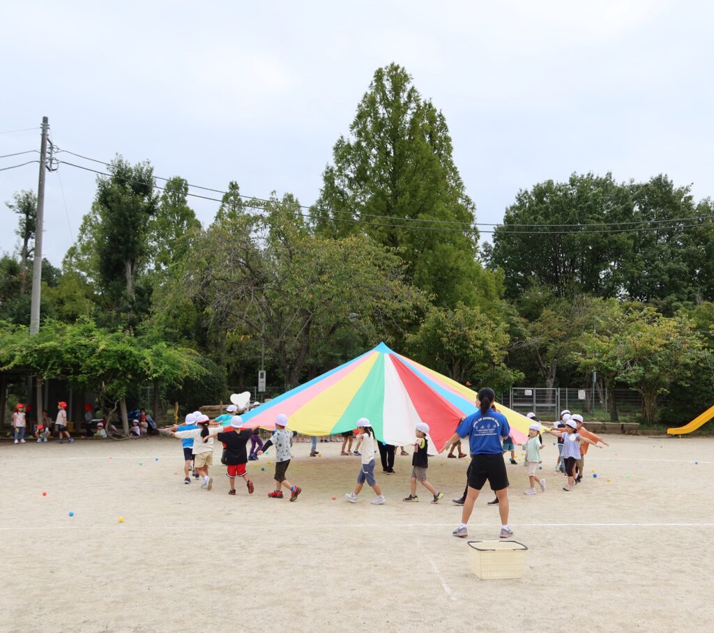 体育指導があり、年長組は園庭でパラバルーンを音楽に合わせて取り組みました。様々な表現をしっかり