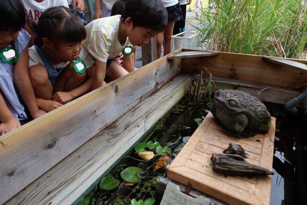 亀・・・名前は「カメルン」🐢 今まで、クラスのお部屋で飼育していましたが、人が大好き、活発に動き回り、そろそろ大きな池に放そう~と、年長児がお池に放してあげました。「バイバイ~」「広い池で楽しんでね」はじめは、どんな動きをするのか、静かに見守っていました。いつでも会えるからね・・・またね。