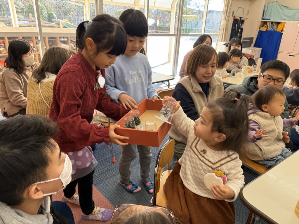 カテゴリー 園の様子 ひよこクラブ 投稿者 作成者: mizukinodirector 投稿日 2025年12月15日 固定投稿 今学期最後のひよこクラブがありました。12月生まれの誕生会は、みんなで2名のお友だちをお祝いしたり、おやつを食べました。もうすぐクリスマスです🎅担当の先生がクリスマスマジックショーをしてくれたり、年長組のお友だちが手作りのまつぼっくりツリーをプレゼントしてくれました。また、来年も親子で遊びましょう。 冷たい風が吹いていたけど、外遊びが大好きなお友だち、お日様パワーを浴びて元気いっぱいに過ごしていました。帰りの園バスに乗車🚌=1コースさん、さようなら~。 いい笑顔をありがとう~! ← 読み聞かせ隊