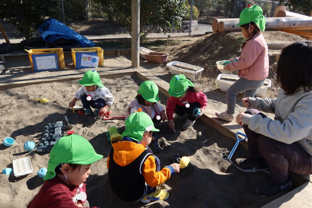黄緑帽子のたんぽぽ組さん、砂遊びしています。のんびり、ゆったりとした雰囲気で砂の感触を楽しみ、先生、お友だちが側にいるから気持ちも安心できるみたいですね。あたたかい1日でした~