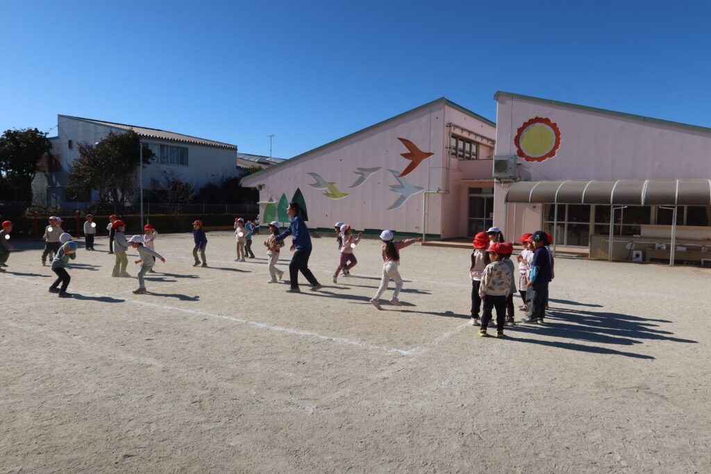 青空の下で、丸太のアスレチックで1本橋渡りしたり、座っておしゃべりしたり、笑顔がいっぱいです。ぽかぽか陽気で外遊びする子どもたちの様子です。午後からドッジボールをしよう!と年長組は、体育指導講師と一緒に張り切って試合が始まりました~