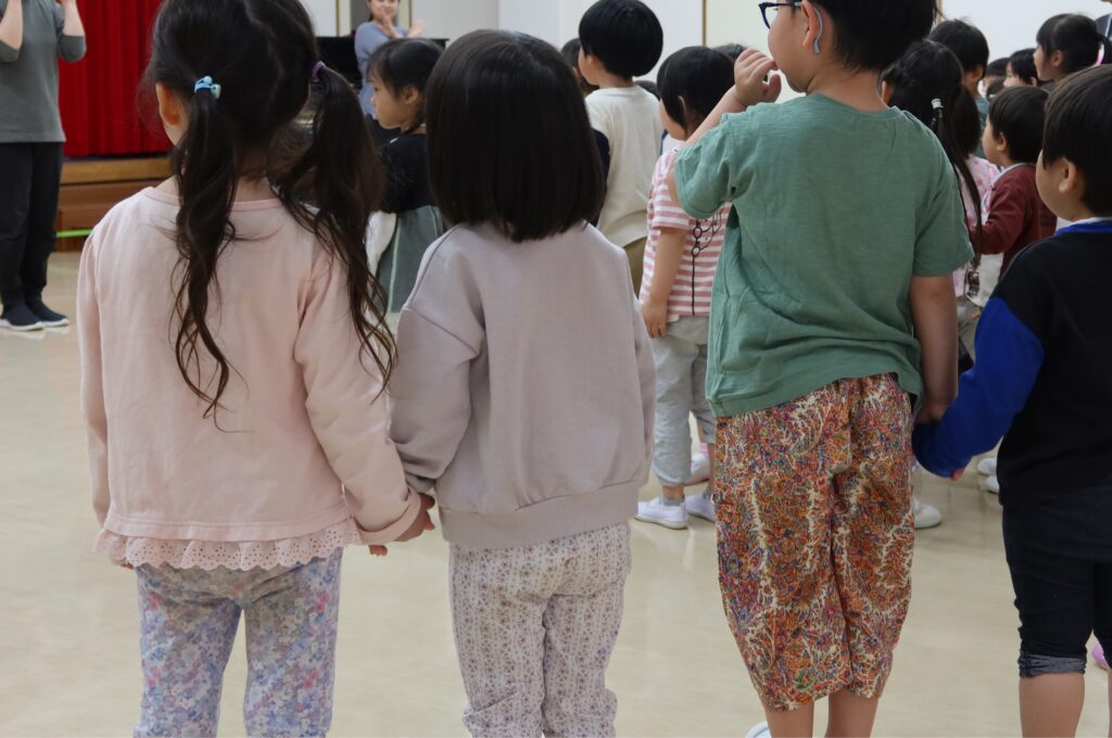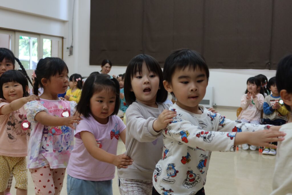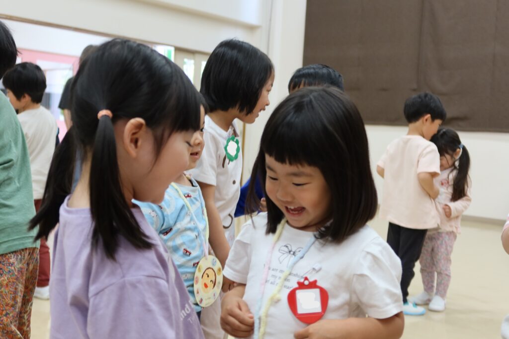 年長さんと二人組で、○×ゲームや触れ合い遊びも沢山楽しみ、初めは緊張していた年少さんでしたが、お兄さんやお姉さんの誘導に安心してゲームに参加していました。これから、お互いに宜しくお願いします。