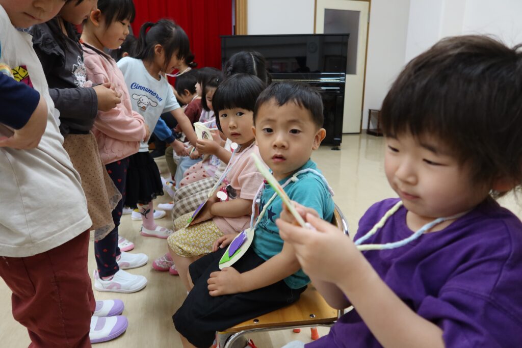 幼稚園新学期が始まり、1週間が経ちました。少しずつ園生活に慣れてきた年少さん。初めて、みんなが顔合わせする日「ウェルカムパーティー」を行いました。年長、年中のお友だちの歌を聴いたり、年長さんと一緒に手を繋いで園内スタンプラリーをしました。手作りのペンダントを首に下げてもらったら「可愛い~🌷」と笑顔になりました。