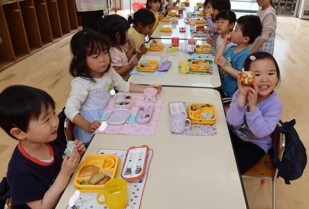 年中組さん、食事中にお邪魔します!給食のメニューを一つずつ確認したり、好きなものから一口ずつよく噛んで味わって食べていました。給食やお弁当をお腹いっぱい食べてパワーアップ~午後の遊びも元気に沢山遊んでいます。園内には、すずらんの花も咲き始めて甘い香りが漂っています。