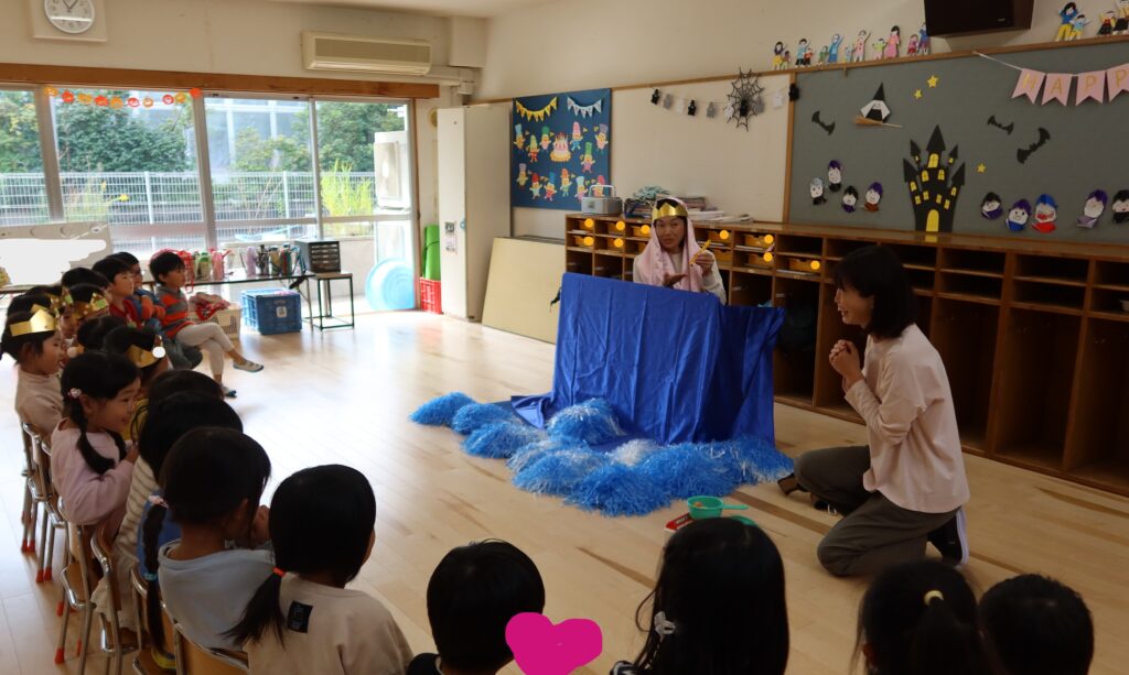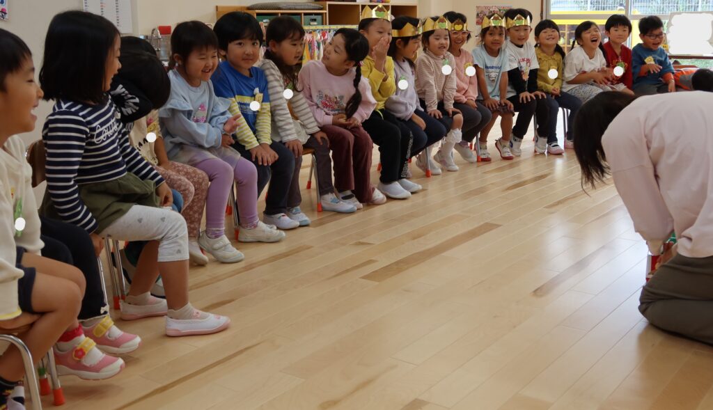 年中組合同、10月生まれの誕生会でした。先生たちからのプレゼントは、「金のスプーンと銀のスプーン」寸劇でした~「あれ?金の斧・・・のお話じゃないね。でもこっちの方が面白い!!」先生たちのやりとりする台詞やストーリーアレンジが子どもたちにわかりやすく、笑いあり、お話の内容を理解して楽しんで観ていました。