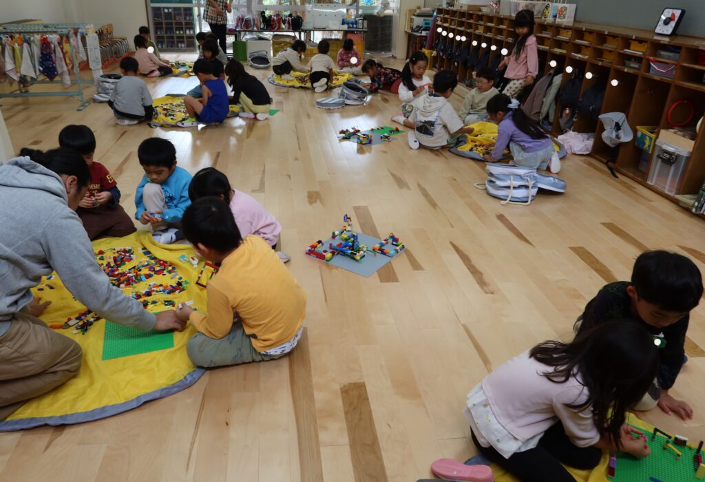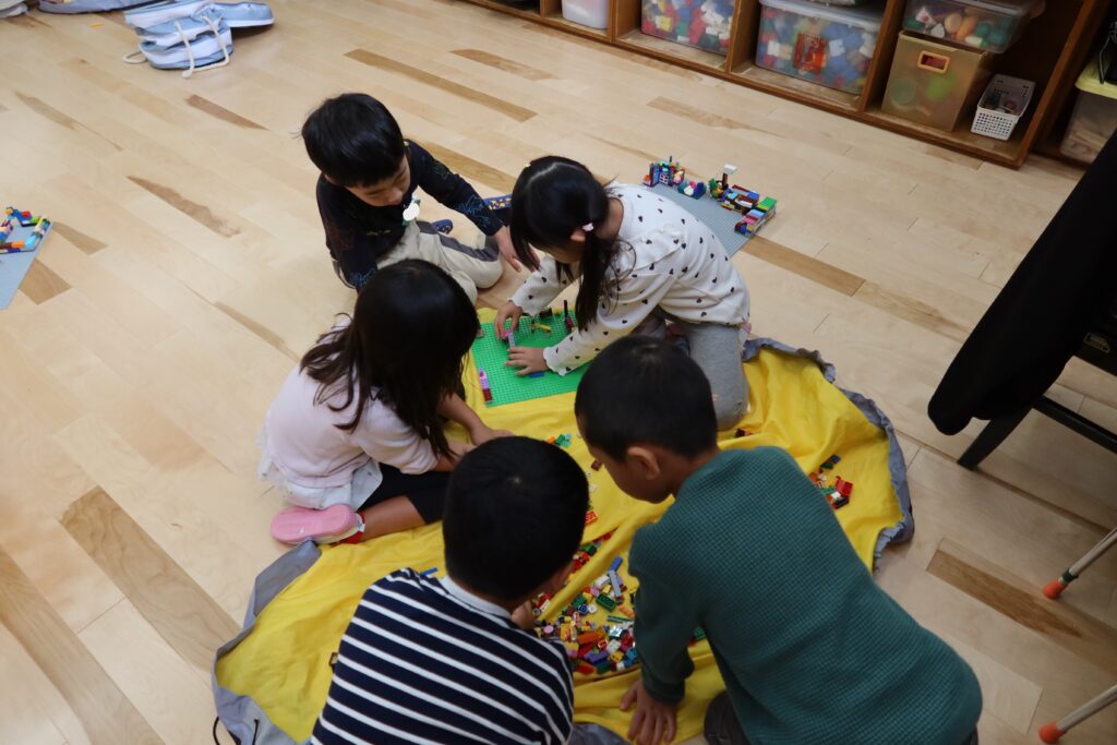 年長組は、副園長先生の指導でLEGO活動でした。テーマは、「①一人、1軒家をつくる②グループのお友だちとみんなの公園をつくる」家は、自分で飾りたい小物や椅子、屋根の色や形にこだわったり、自分の納得のいくものを創っていました。グループ制作では、「公園って木があるね、ベンチがあったら休めるね、滑り台あったらいいね~」「ここに、こういうものがあったらどうかな・・・」友だちと会話が弾みました。作品をみせながらグループ発表をしました。どの作品も楽しそうなものばかりでした。