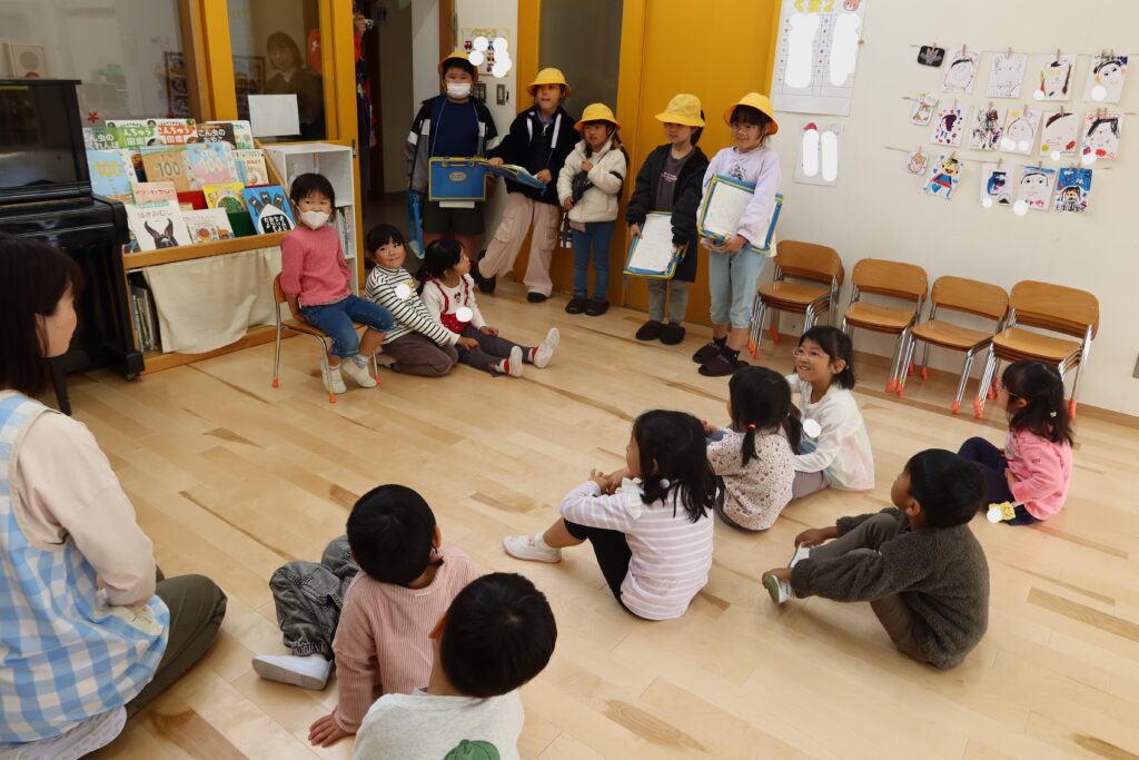 隣の郷州小学校2年生が町探検に来園してくれました。5人の中に2人卒園生が来てくれて、久しぶりの園舎・園庭・先生たちに会えて懐かしさと嬉しさでいっぱいのようでした。早速、準備してきた質問を順番にインタビューをされ、各教室を見学されました。年長組の部屋に入ると朝の会をするところだったので、2年生も一緒に歌をうたったり、お姉さんから「みんな頑張ってるね、1年生になっても大丈夫だよ!!待ってるからね~」と優しい言葉をかけてくれていました。