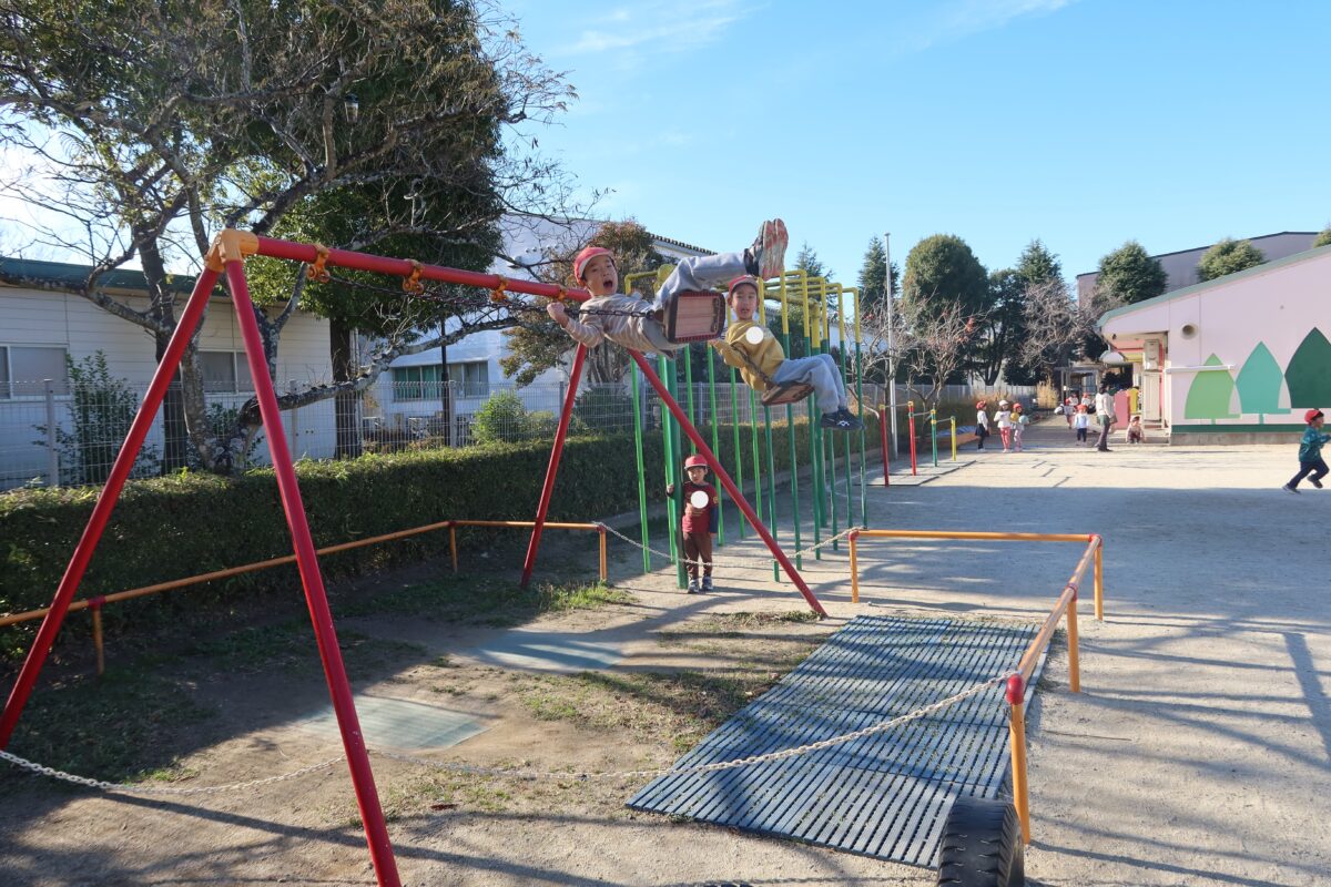 午後の自由遊びは、園庭が子どもたちがのびのびと体を動かし、元気いっぱいです。年長児は、ブランコで勢いよく漕いでいましたが、青空の下で風を切り、気持ちがすっきり!!楽しいよ~といい笑顔でした。