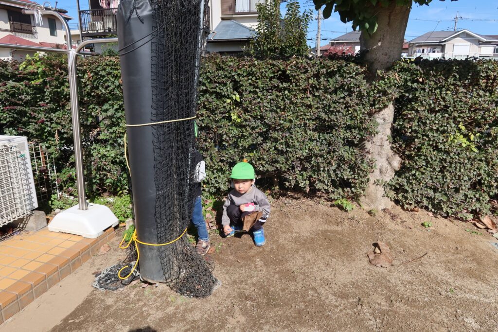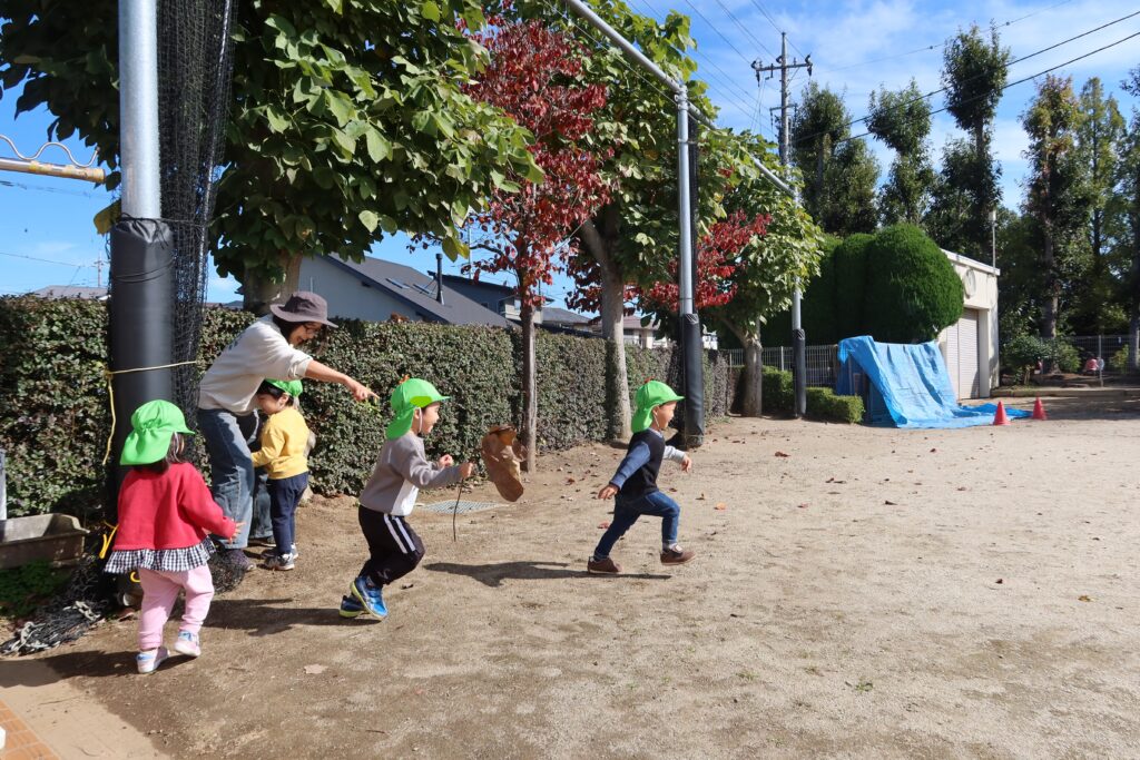 KidsHouseの後ろに隠れていたお友だちも見つかっちゃたようです。見つけてくれて嬉しそうな表情しています。遊びが広がっていてみんなと遊ぶ楽しさを感じています。秋晴れの下で、みんな気持ち良さそうに元気いっぱい遊んでいます。