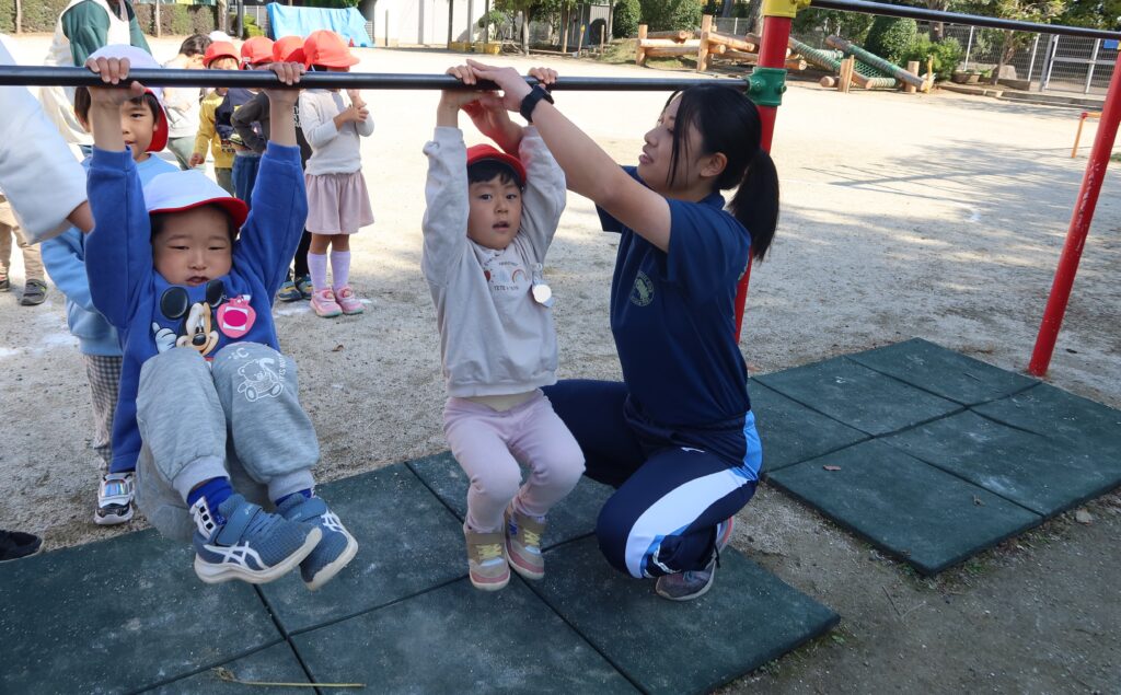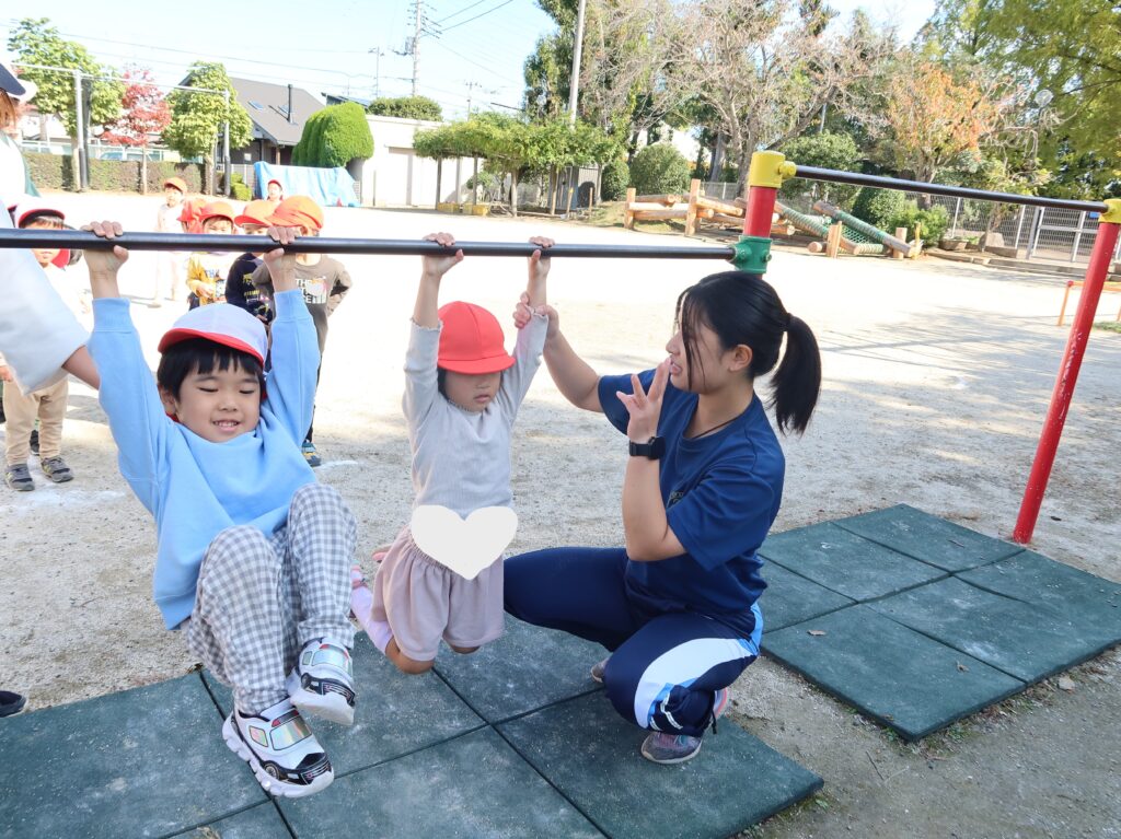 年少組:体育指導では、鉄棒を取り組みました。掴み方を確認しながら、5まで数えて、ぶら下がれるように、頑張っていました。