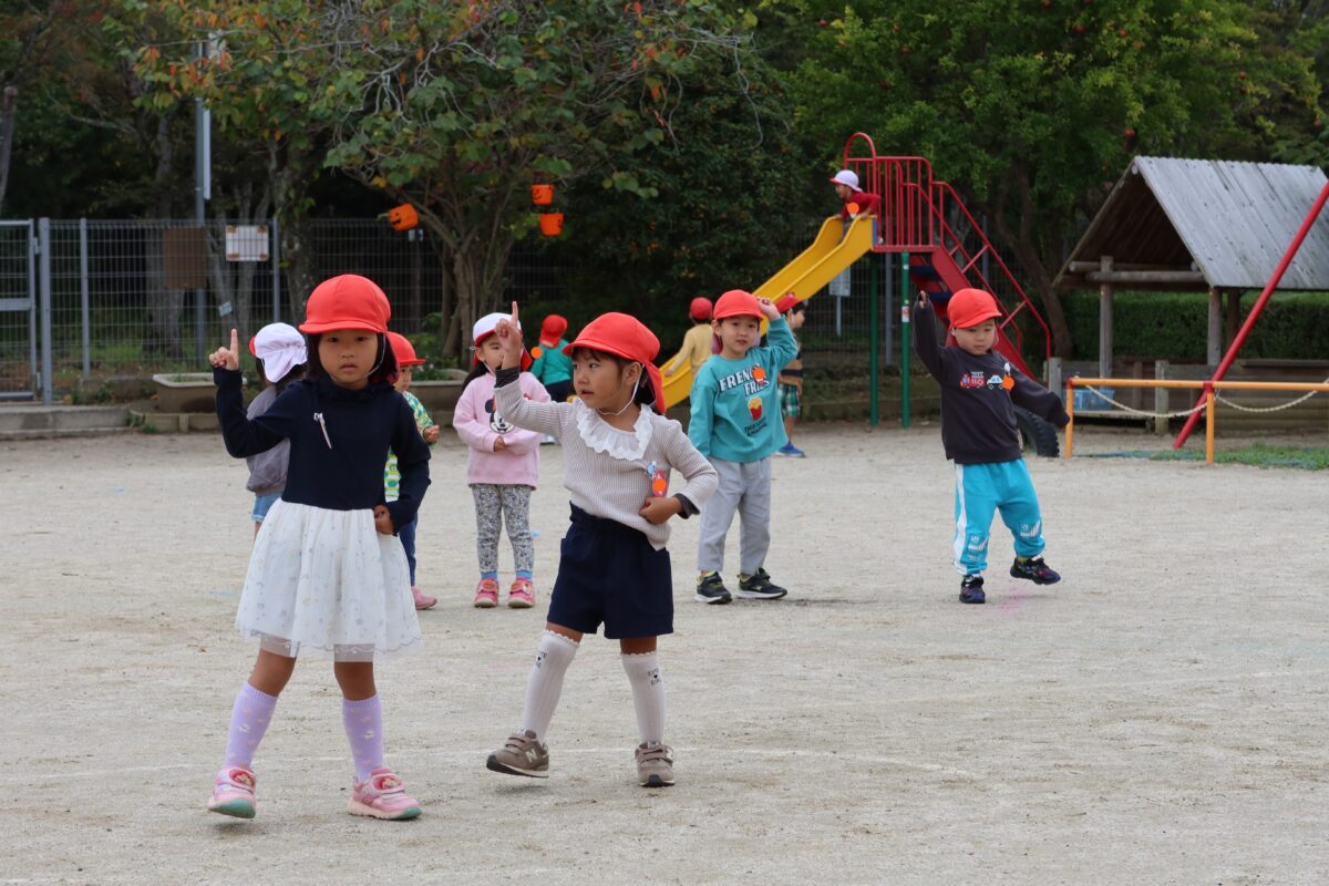 今日は、雨があがって朝から園庭は、賑やかです♪子どもたちが自由にダンスを踊っています。運動会が終わってから異学年のダンスを覚えていて踊る子やハロウィンのダンスをノリノリで踊っています。次々に流れる音楽にのって、かわいい笑顔やかっこいい表情・決めポーズも最高!!余韻を楽しんでいます~