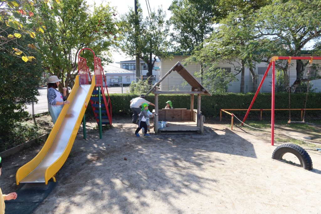 KidsHouseの後ろに隠れていたお友だちも見つかっちゃたようです。見つけてくれて嬉しそうな表情しています。遊びが広がっていてみんなと遊ぶ楽しさを感じています。秋晴れの下で、みんな気持ち良さそうに元気いっぱい遊んでいます。