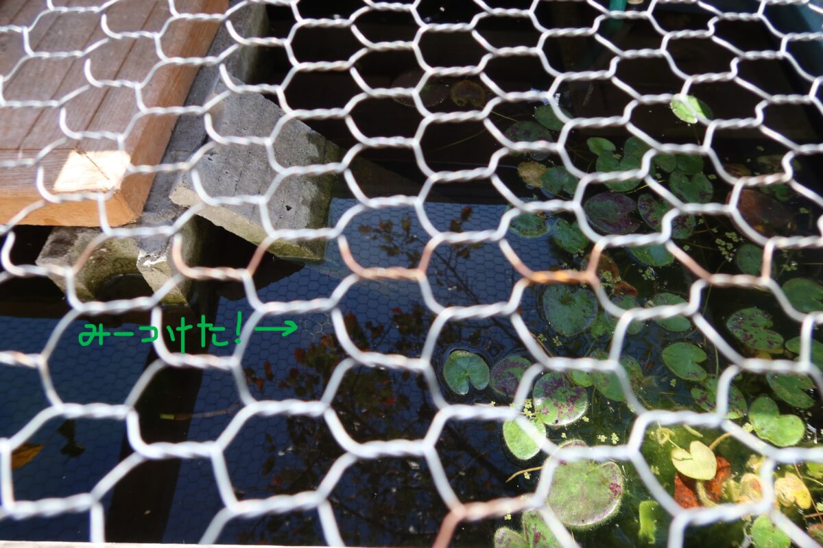 池の中に住んでいるのは・・・?金網模様と重なり、やっと見つけました。