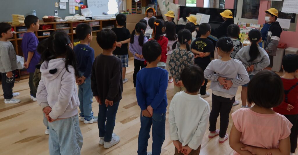 隣の郷州小学校2年生が町探検に来園してくれました。5人の中に2人卒園生が来てくれて、久しぶりの園舎・園庭・先生たちに会えて懐かしさと嬉しさでいっぱいのようでした。早速、準備してきた質問を順番にインタビューをされ、各教室を見学されました。年長組の部屋に入ると朝の会をするところだったので、2年生も一緒に歌をうたったり、お姉さんから「みんな頑張ってるね、1年生になっても大丈夫だよ!!待ってるからね~」と優しい言葉をかけてくれていました。