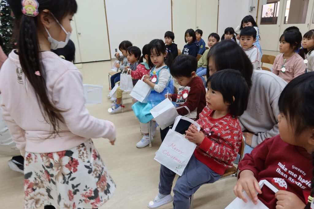 満3歳児クラスのお友だちを招待して、年長組さんがハンドベルの演奏を聴かせてくれました。そのあと、一人ずつ、自分たちで作ったまっぼっくりツリーをプレゼントしました~年長組さん、ありがとう!!